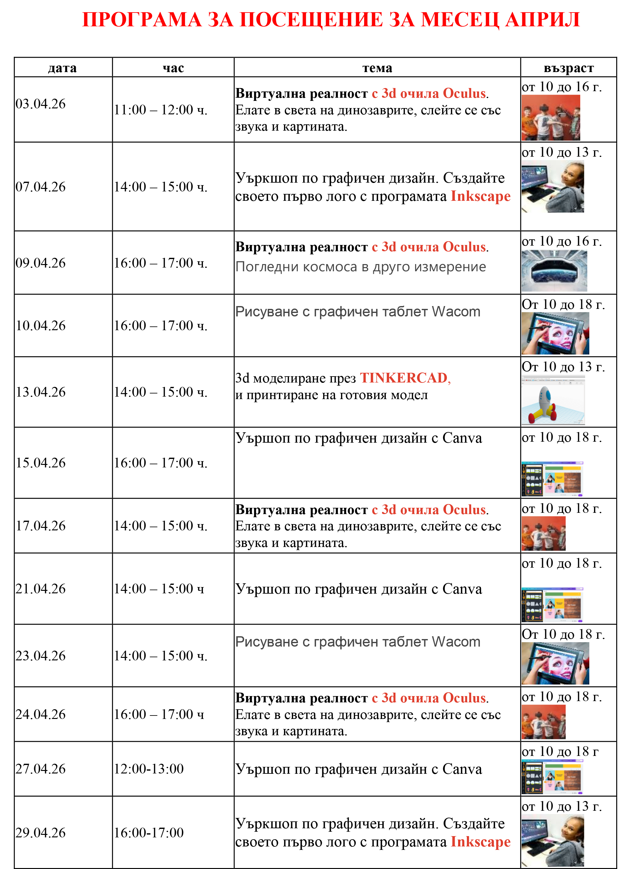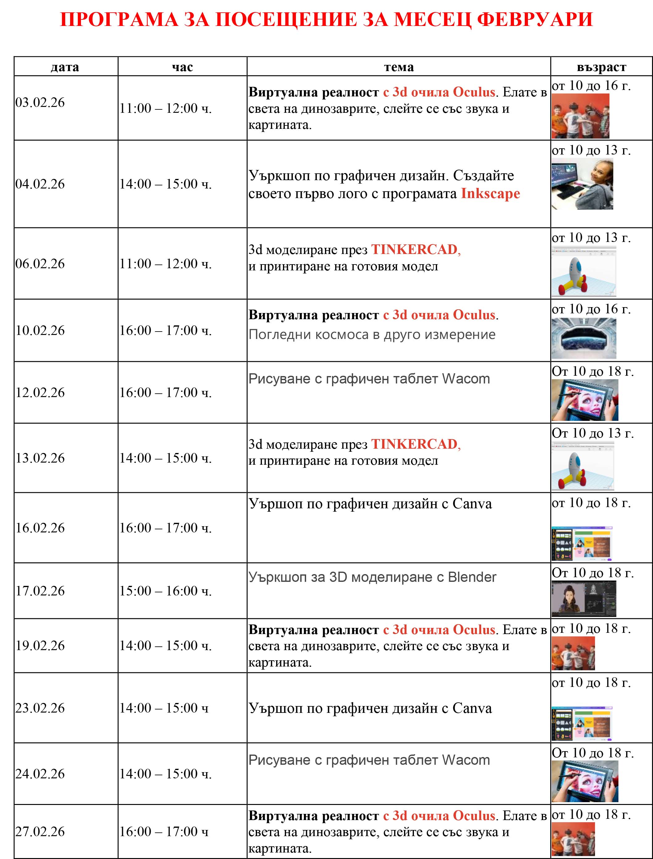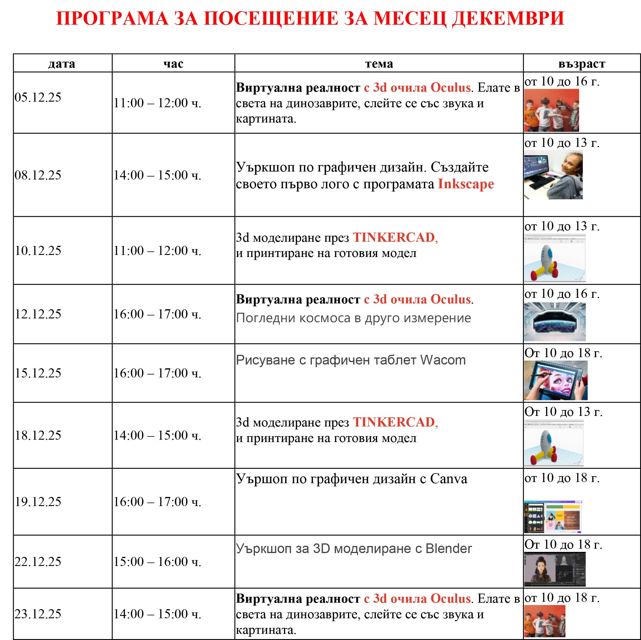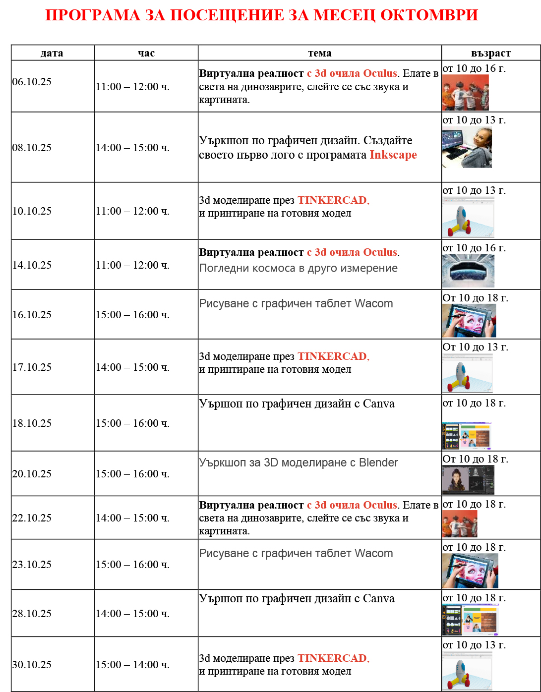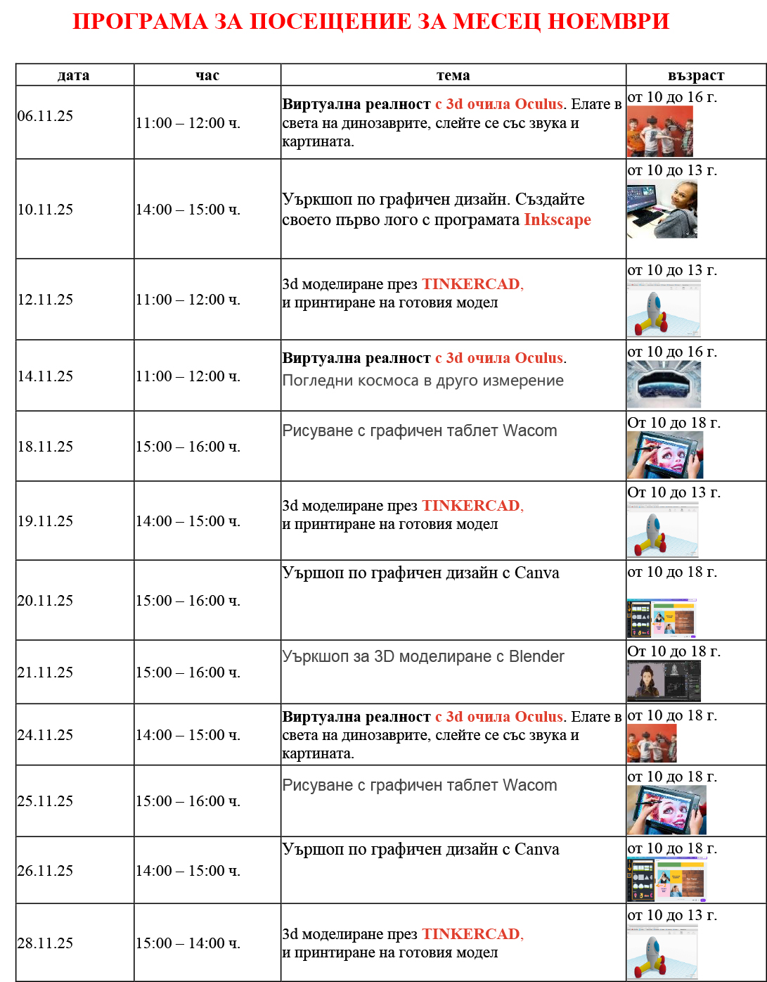 - Уъркшопове за работа с 3D принтер, Canva, Video Editor, и др.;